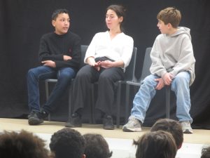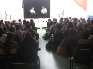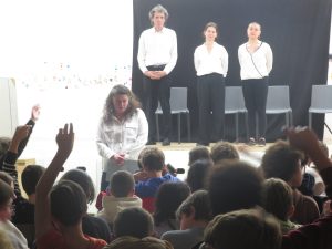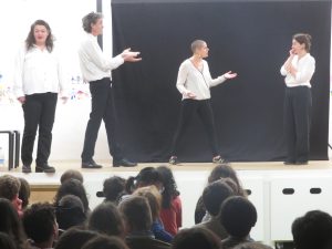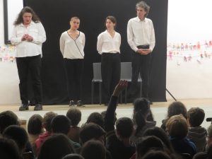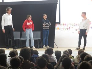 Au fur et à mesure du spectacle, les comédiens sollicitent l’avis des élèves sur la façon dont ces situations pourraient ou auraient pu être résolues de manière positive….