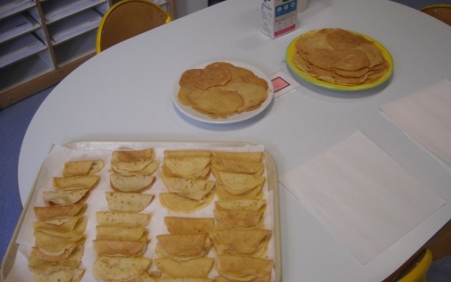 Vendredi 2 février : fête de la chandeleur. Après avoir préparé la pâte le matin, la classe a dégusté des crêpes l’après- midi.