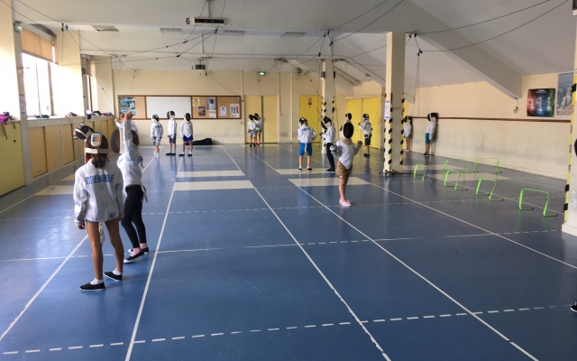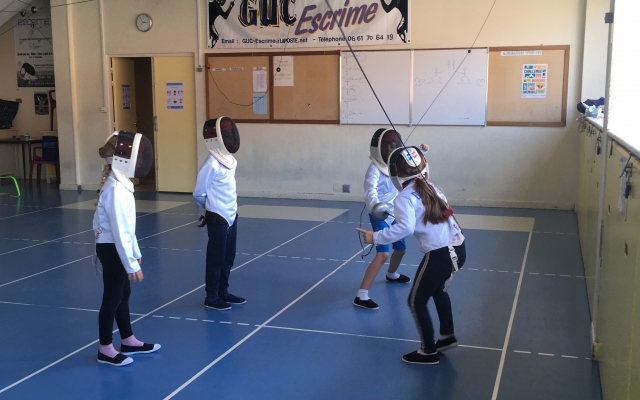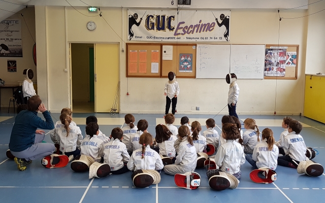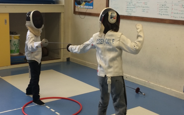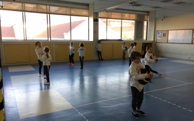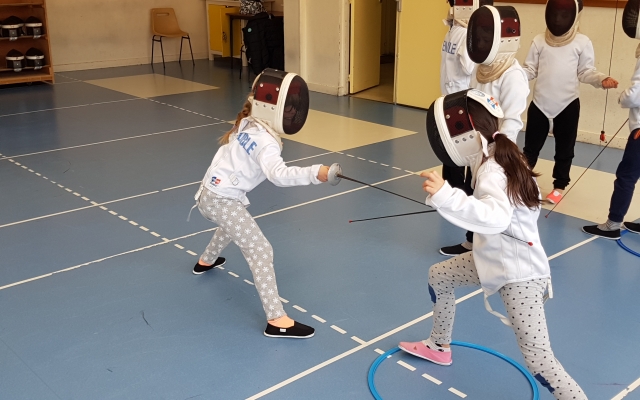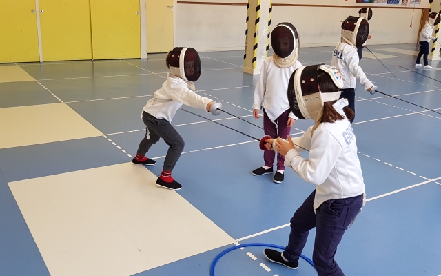 Le cycle d’initiation à l’escrime touche à sa fin pour les CE1. Tout au long des 9 séances, ils ont appris à monopoliser tous leurs sens par des jeux avant de prendre le fleuret en main et commencer les combats. A tour de rôle, ils sont escrimeur ou arbitre et font de très beaux combats.
