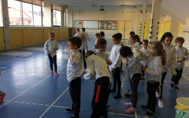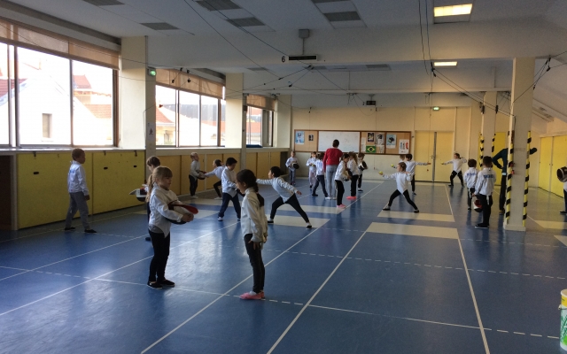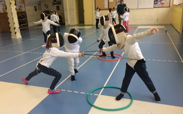 Depuis la rentrée en septembre 2017, les élèves de la classe de CE1 vont à l’escrime chaque semaine. Découverte d’un nouveau sport pour la plupart, il leur a fallu aborder l’activité sous la forme de jeux mobilisant toute leur attention avant de prendre les fleurets et commencer les combats.
