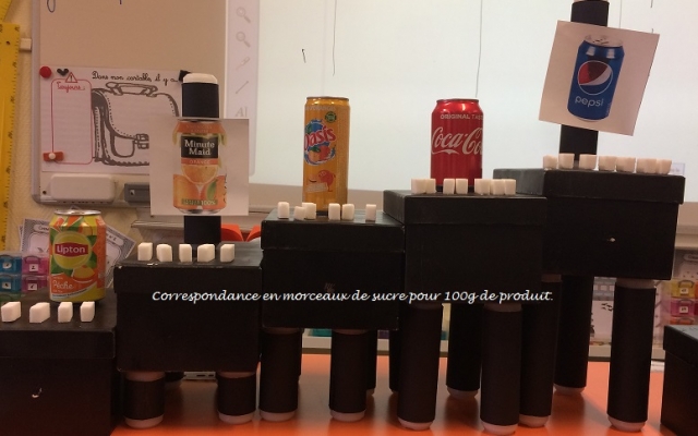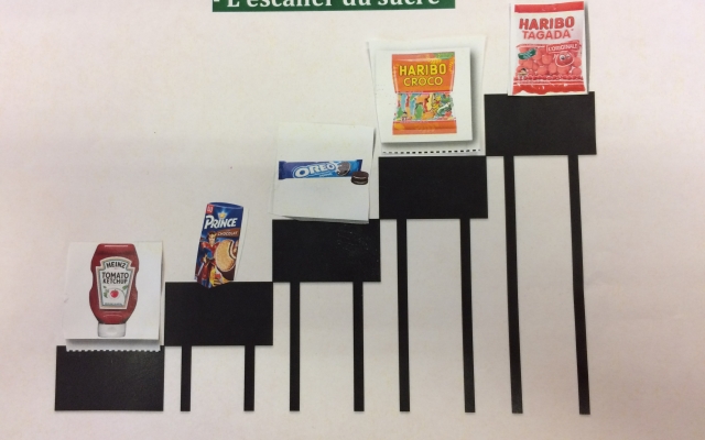 Par petits groupes, les enfants ont rangé selon leur avis des boissons et des aliments sur un escalier du sucre. Maëlys a ensuite placé devant chaque marche la correspondance en morceaux de sucre pour 100g, révélant ainsi tout le sucre caché…. Elle a cependant insisté sur le fait que beaucoup d’aliments contiennent du sucre naturel, le fructose, très bon à la santé et à consommer sans modération (dans les fruits par exemple).